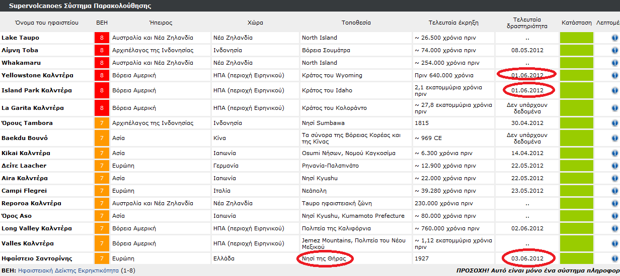 Όπως θα δείτε και στον πίνακα που έχει αναρτήσει παρακάτω το ηφαίστειο της Σαντορίνης είναι στην τελευταία και 17 θέση του πίνακα ενώ το Yellowstone στην Αμερική αναρριχήθηκε στην 4η μόλις θέση με τελευταία δραστηριότητα την 1 Ιουνίου 2012.