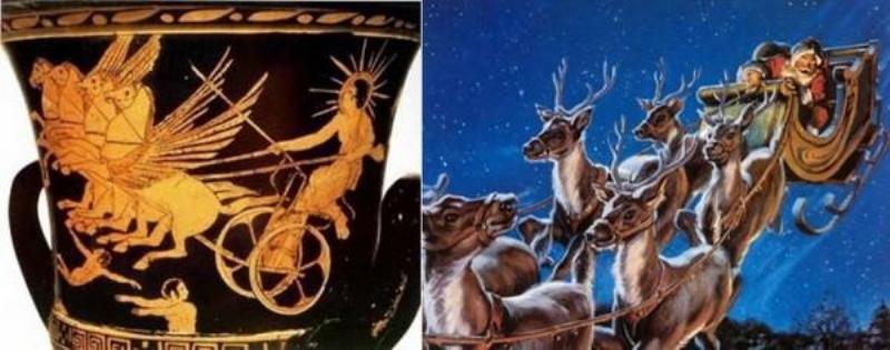 Φυσικά μεγάλη εντύπωση προκαλεί και το μυθολογικό γεγονός του «Αγιοβασίλη» με το έλκηθρο του που το κινούν οι ιπτάμενοι τάρανδοι. Ούτε αυτό όπως καταλαβαίνετε, δεν θα μπορούσε να μην παρθεί απο την Αρχαία Ελλάδα. Όπως αναφέραμε πιο πρίν , τον μήνα Δεκέμβριο, οι Έλληνες γιόρταζαν τον Διόνυσο αλλά και τον Φωτοφόρο Απόλλωνα-Ηλίου παριστάνοντας τον πάνω στο ιπτάμενο άρμα του, να μοιράζει το φως. Το άρμα έγινε έλκηθρο, τα άλογα έγιναν τάρανδοι και το «δώρο» του φωτός που μοίραζε στους ανθρώπους …έγινε κυριολεκτικά «μοίρασμα δώρων».