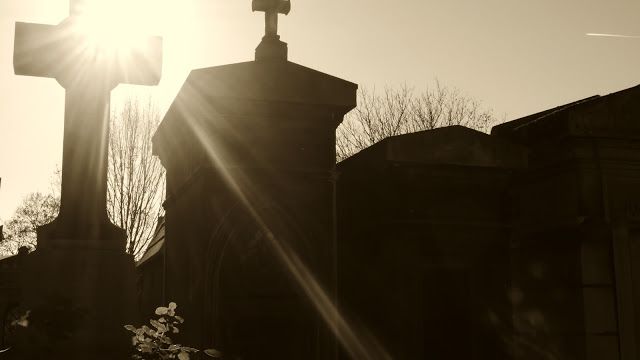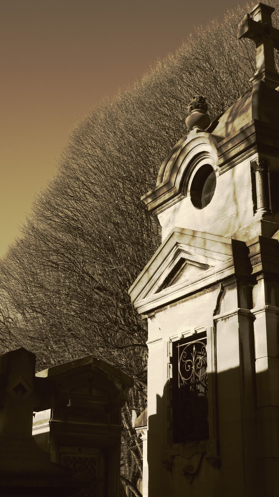 Ανηφορίζω ένα μονοπάτι και είναι σα να βρίσκομαι σε δάσος, ο ήλιος χάνεται πίσω από το πλέγμα των κλαδιών και το κρύο γίνεται ακόμη πιο διαπεραστικό. Και ανάμεσα από τους πανύψηλους κορμούς παντού προβάλλουνε οι Τάφοι, το δεύτερο Στοιχείο του χώρου. Άλλοι ψηλοί σαν κτίρια, άλλοι μικρότεροι σε μέγεθος τηλεφωνικού θαλάμου, κάποιοι πιο ταπεινοί στο επίπεδο του εδάφους. Τάφοι επιφανών οικογενειών, μαυσωλεία, μεμονωμένοι τάφοι διάσημων ανθρώπων της τέχνης, της πολιτικής, της διανόησης.