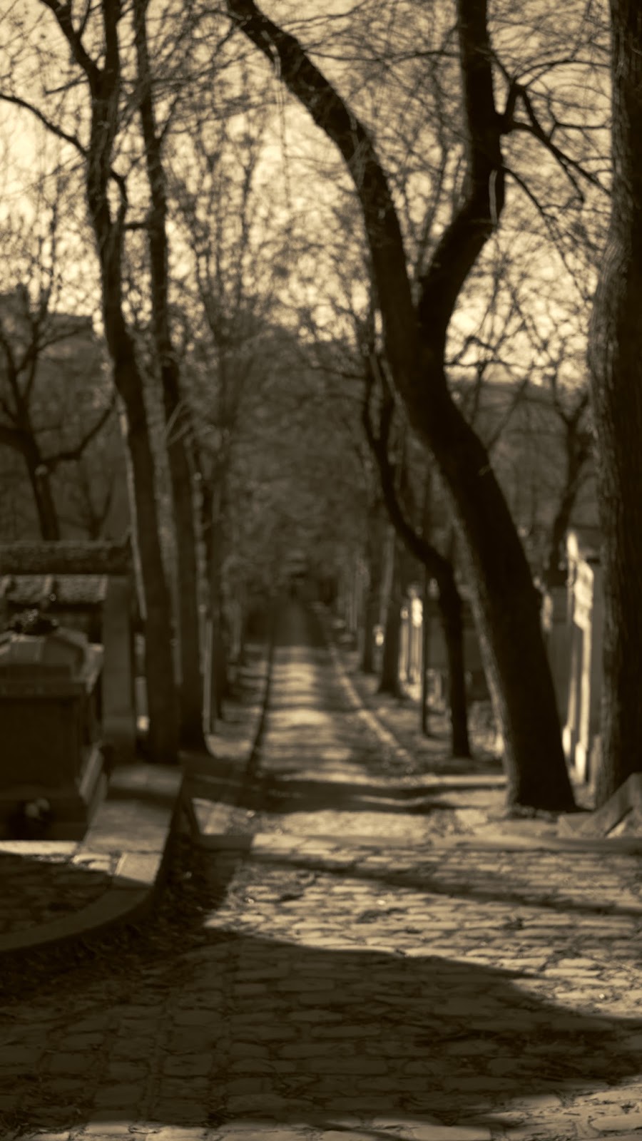 Père Lachaise έχουν συμπληρωθεί και αναδύονται πανίσχυρα μέσα σε έναν οργασμικό συνδυασμό. Τα Δέντρα σείονται εκεί ψηλά, ενώ οι Δρόμοι γίνονται λαβύρινθοι που με παγιδεύουν όλο και πιο βαθιά, οι Τάφοι βουλιάζουν κάτω από τις αιώνιες σιωπές τους ενώ κάποια από τα Αγάλματα μου γνέφουν ότι έχουν κάτι να μου πουν και με καλούν κοντά τους. Κινούμαι όλο και πιο γρήγορα, βαδίζω προς τα εκεί που ακούγονται φωνές ανθρώπων. Ένα ζευγάρι στρίβει σε ένα από τα στενά μονοπατάκια, εκείνος γύρω στα πενήντα, γκριζομάλλης με γυαλιά, εκείνη αρκετά πιο νέα τυλιγμένη σε ένα γούνινο παλτό. Τους παίρνω από πίσω μέχρι το σημείο όπου σταματούν.
