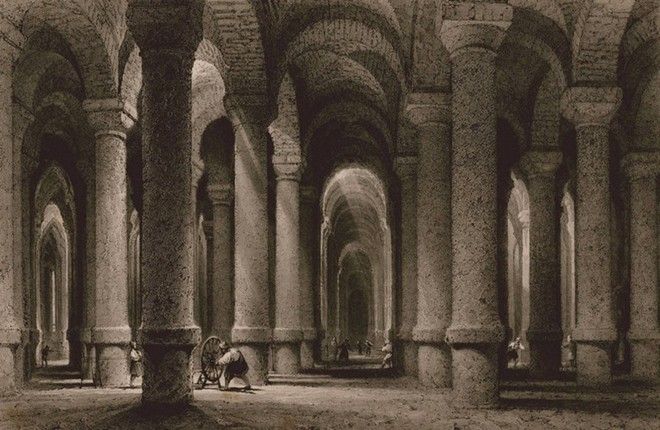 Η κινστέρνα είχε, αρχικά, 336 μαρμάρινους κίονες ύψους 8 μέτρων, τοποθετημένους σε 12 σειρές με 28 κίονες η καθεμία, σε απόσταση 4 μέτρων η μία από την άλλη. Ήταν από τα σημαντικότερα δημόσια έργα του Ιουστινιανού, με σκοπό την ύδρευση της Πόλης και αποτελούσε εξαίρετο δείγμα βυζαντινής μηχανικής. Το 1937 άρχισαν έρευνες στο υπέδαφος της Αγίας Σοφίας. Οι έρευνες διακόπηκαν, λόγω της έναρξης του Β´ Παγκόσμιου Πολέμου. Το 1945 αποφασίστηκε να αντληθεί το νερό κάτω από την εκκλησία ώστε να διευκολυνθούν οι έρευνες. Η στάθμη του νερού όμως δεν κατέβηκε ποτέ και η μηχανή άντλησης κάηκε λόγω της υπερπροσπάθειας, τερματίζοντας και αυτή την απόπειρα.