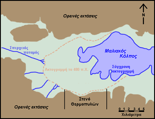 Ενώ ο Ξέρξης συνεχίζει την προέλασή του στον ελλαδικό χώρο, οι Έλληνες ορίζουν την πρώτη θαλάσσια γραμμή άμυνας στο Αρτεμίσιο, ενώ στη στεριά επιλέγονται τελικά οι Θερμοπύλες. Στο έβδομο βιβλίο της «Ιστορίας» του, ο Ηρόδοτος αναφέρει: «Αυτή λοιπόν ήταν η θέση του Ξέρξη και του στρατού του στην Τραχινία της Μηλίδας, ενώ οι Έλληνες είχαν καταλάβει τα στενά που είναι γνωστά στους ντόπιους ως Πύλες, αυτά που οι υπόλοιποι Έλληνες ονομάζουν Θερμοπύλες».
