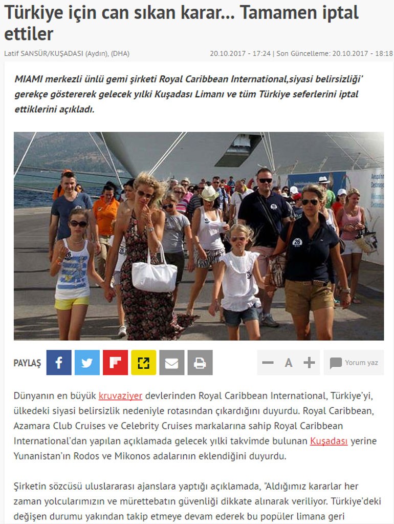 Ο κολοσσός της παγκόσμιας κρουαζιέρας Royal Caribbean International ακύρωσε για το 2018 όλες τις κρουαζιέρες που ήταν προγραμματισμένες για την Τουρκία.