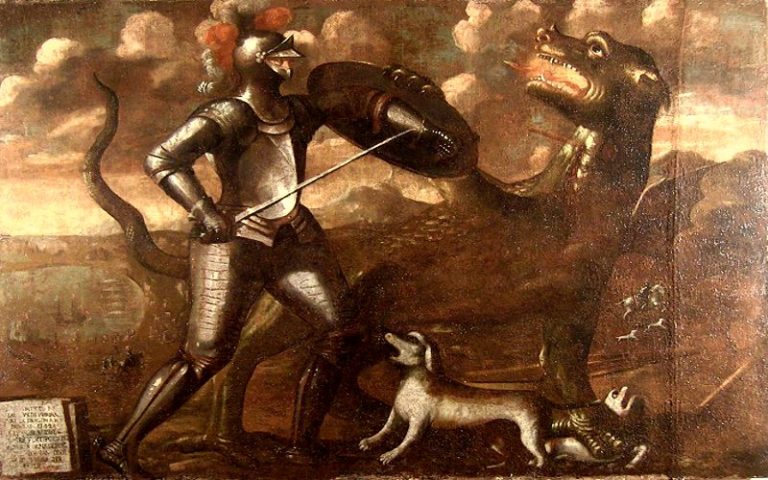 Κάποια στιγμή, ο δράκος πετάχτηκε από την κρυψώνα του και όρμησε κατά πάνω στον ατρόμητο και πολυμήχανο Ιππότη, σφυρίζοντας με μανία και χτυπώντας με πάταγο τις πανίσχυρες φτερούγες του. Ο Ιππότης προχώρησε με πρωτοφανή σιγουριά και αυτοπεποίθηση προς το κτήνος, σημαδεύοντάς το με τη λόγχη του στη ράχη. Μα, τα λέπια του ήταν τόσο σκληρά, ώστε η λόγχη του έσπασε και το θηρίο ούτε που λαβώθηκε.