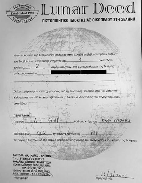 Όπως αναφέρει η dimokratiki.gr η 39χρονη Ροδίτισσα δήλωσε ότι το οικόπεδο στη Σελήνη προορίζεται για την κόρη της, που σήμερα είναι 18 ετών.